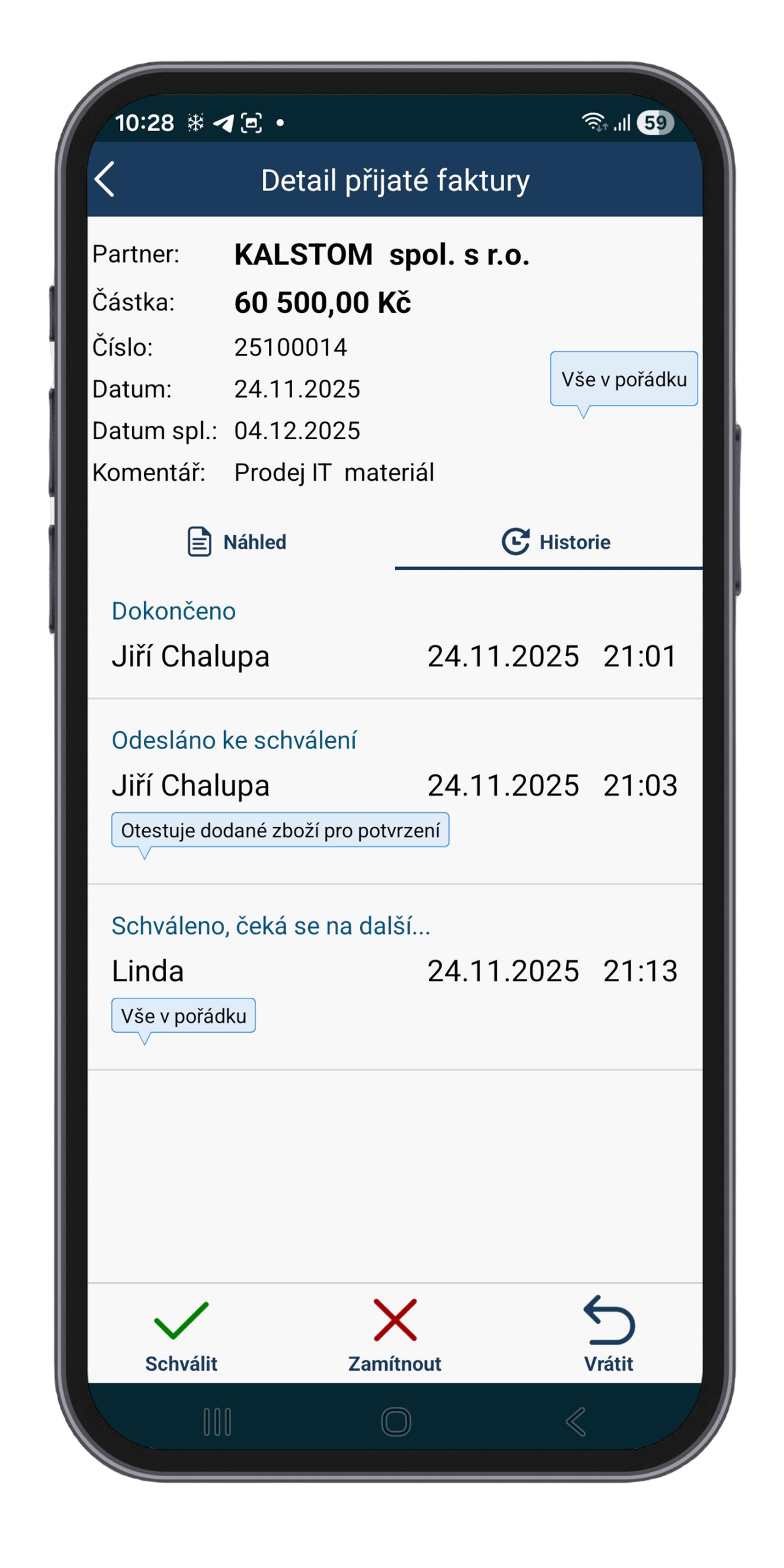 Ať jste na cestách, doma, na poradě nebo jen daleko od počítače – schválení už nemusí čekat. Vše vyřídíte během pár vteřin. Nyní testujeme verzi pro Android a již pracujeme na verzi pro IOS.