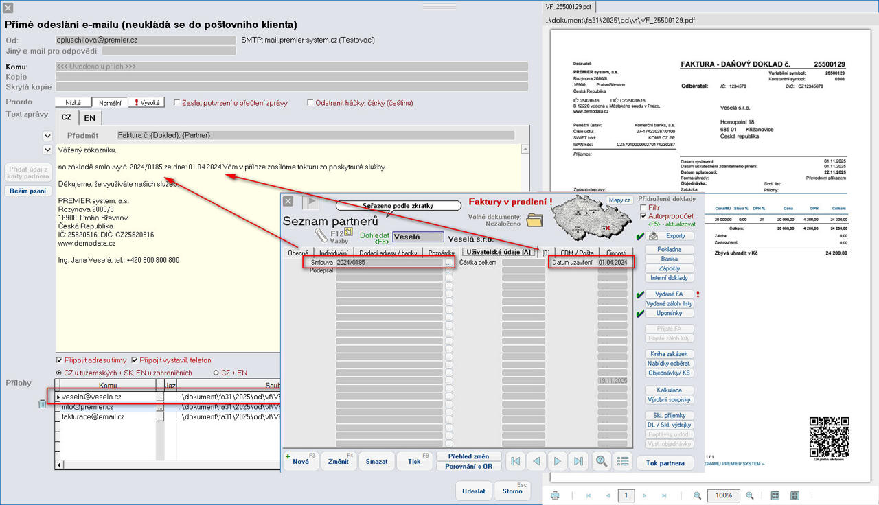 - Rozesílání upomínek včetně upomínaných faktur (jednotlivě i hromadně).