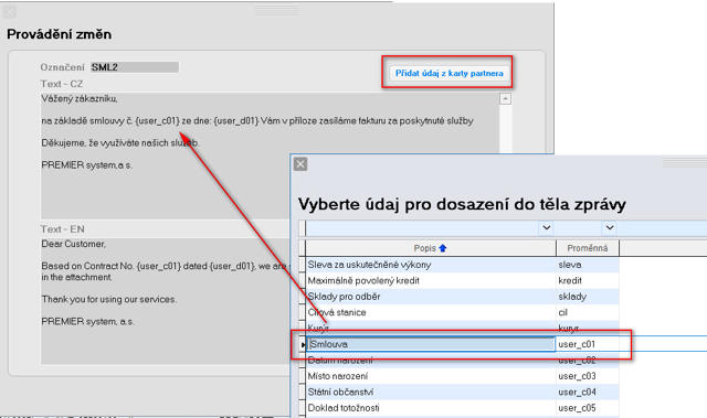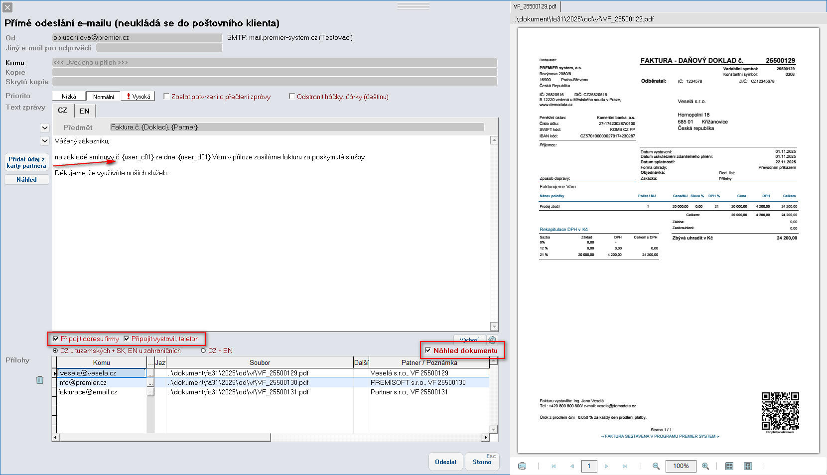 Pokračujeme v modernizaci práce s dokumenty. Zcela jsme přepracovali editor pro odesílání exportovaných dokumentů, který nyní nabízí pohodlnější ovládání, větší obrazovku a další praktické funkce pro práci s e-maily. Především doporučujeme novou funkci v těle e-mailu a to možnost vkládat údaje z partnera formou “proměnné”, což má význam při hromadném rozesílání dokladů, když každý adresář může mít v textu automaticky zvolený údaj z karty partnera