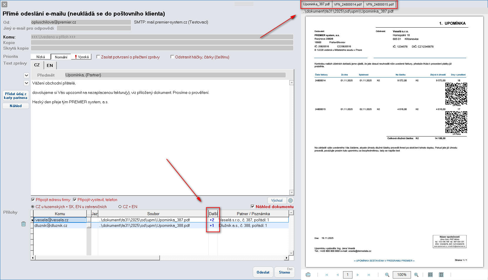 Klíčovou novinkou je možnost odeslání upomínek, a to včetně upomínaných faktur jednotlivě i hromadně. Exportované faktury jsou automaticky připojeny jako další přílohy e-mailu. Pokud faktura dosud exportována nebyla, program ji automaticky vyexportuje v základní tiskové sestavě a připojí do e-mailu. Odesláním upomínek společně s fakturami se vyhnete následnému doposílání dokladů a zrychlíte komunikaci s odběrateli.