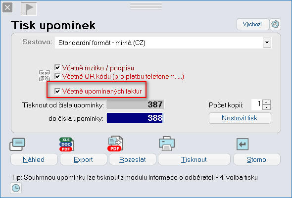 - Uživatelské nastavení voleb tisku/exportu upomínek.
