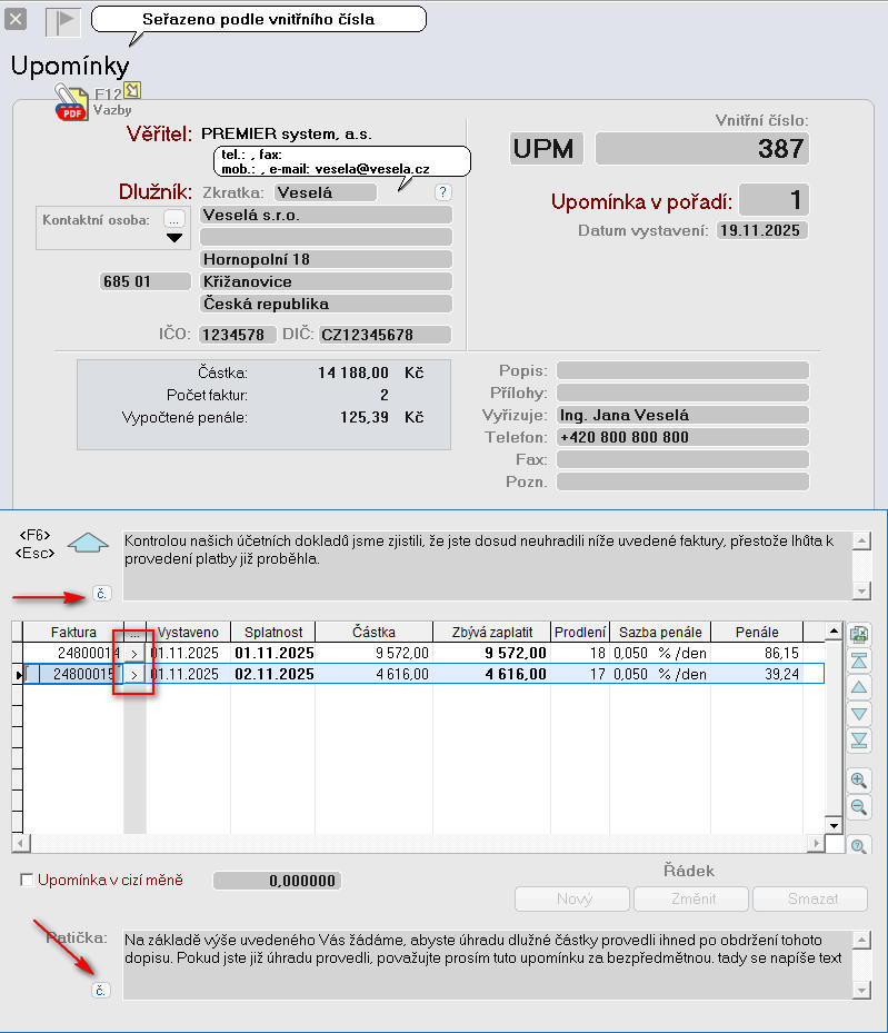 - Nově má uživatel k dispozici číselníky textů upomínek (úvodní text, patička).